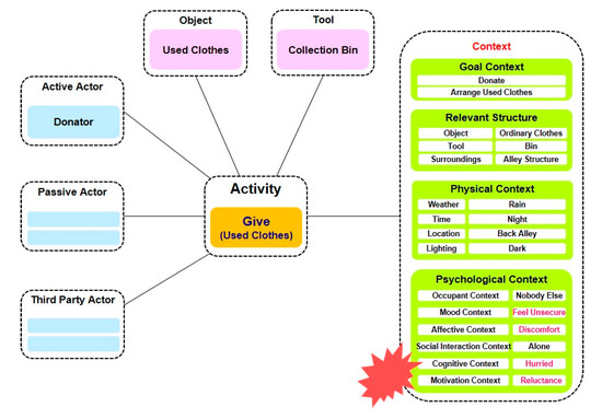 A key activity in the journey is the donator’s activity of giving used clothes with the tool of the collection bin. The activity and relevant experiences can be varied a lot depending on the contexts. Now suppose that a housewife would have to donate used clothes at night on a rainy day. As most collection bins are located in back alleys, the activity of giving used clothes using the bin in such a physical context would make for an emotionally unfavorable experience. She would feel unsecure in doing the giving activity alone in the occupant context that nobody else is around and feel uncomfortable due to dirty surroundings. She would have to be hurried if she did. Overall, she would be very reluctant. She would not like to do that at all. This is represented in detail in the CBAM description in Figure 6. If her husband were around, her solution would have been to have him do the activity. In general, this particular activity would be a pain point for many donators.