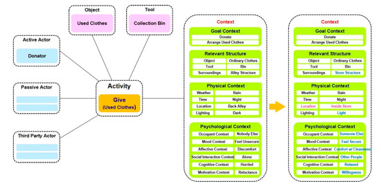 To transform this activity to the positive side is to use What If? Systematically, going over the activity elements and context elements of CBAM description of the activity. While actor, object, and tool elements are not easy to change, some physical contexts can be altered. Changing the weather and the time may not be a proper option to ensure good applicability of this activity regardless of time and weather constraints. The location context might be changed. What if the location is changed from the back alley? What if the location is changed to a community center? Would it be accessible enough? What if the location is changed to a convenience store? In many cities, accessibility of convenience stores is good. They are close enough and open for long hours, often 24 h a day, 7 days a week. Now it is good for donators. Other stakeholders should be considered as well. For the collectors, all convenience stores are accessible with trucks to load and unload stuff. In this way, the What If? hypothesized solution is evaluated for suitability. The to-be activity of giving used clothes as transformed by the What If? method is shown in Figure 7. The relevant structures would be changed also. Note that the physical context of lighting has been transformed from dark to light together with the location context change. Psychological contexts have also been transformed positively, and the pain point is now overcome.