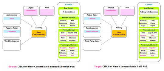 Note that CBAM schema has been supported in service design tasks as a computer-based representation. Images of computer-based service blueprints with CBAM can be found in [30,38]. CBAM schema is, in other words, a formal modeling language for activities. Product lifecycle management (PLM) systems are now advancing to include service lifecycle management (SLM) [57]. As services are basically human activities [30], CBAM will play a key role in the computer-based representation of activities in SLM. Actor elements will be represented based on user modeling containing both static and dynamic information as well as assessment information [58]. Both objects and tools are of the class of PSSs which would include a spectrum from products to services as well as their combination. Goal contexts can be represented as activities and as values. Relevant structures are PSSs. Physical and psychological contexts would be represented as tuples with fields and their state values, as shown in Figure 7 and Figure 10. Note that physical context information can be acquired through various Internet of Things (IoT) sensors and smart devices and that psychological contexts can be associated with user inputs and experience evaluations using CESA as in the personalized customization method in Section 5. CBAM schema associates human activities and artifacts like products and services as used in the design for affordance method [47]. That is, CBAM describes human activities that are related with artifacts as their elements of objects, tools, and relevant structures. In this way, CBAM would form the core representation for combining PLM and SLM.