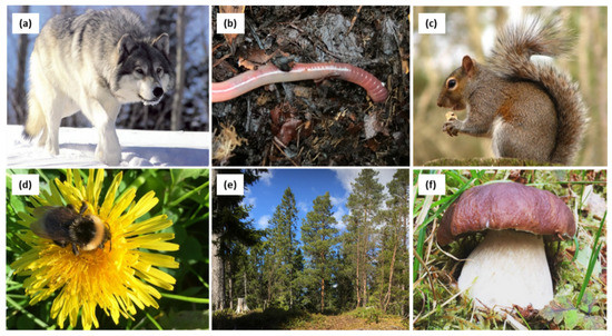 During the interview, we showed children six pictures representing different living organisms (Figure 2). These were a wolf (Figure 2a), an earthworm, Lumbricus terrestris (Figure 2b), a squirrel, Sciurus sp. (Figure 2c), a bumblebee, Bombus sp., feeding on a dandelion, Taraxacum sp. (Figure 2d), some trees (Figure 2e), and a (comestible) mushroom, Boletus edulis (Figure 2f). We asked the name of the organisms when we presented them (in a random order) to the children and then asked which of the organisms they thought was most important for nature. If the children were insecure about the meaning of the question, we reformulated it, asking which of these organisms they though would cause most damage if it disappeared from nature. We also specified that there was no right answer, but we were interested in their ideas and they could rank them as they wished. They could give the same rank to several, or rank all of them from one to six. After they had ranked the organisms, we asked why they had ranked them as they did.