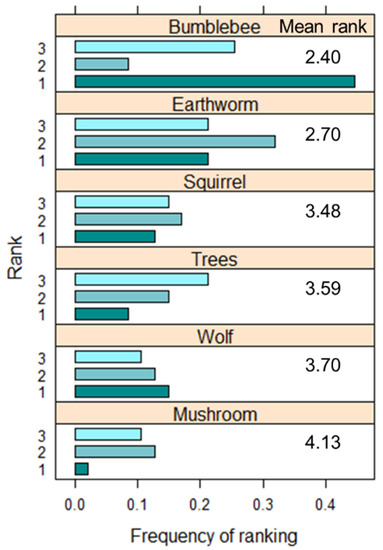 Most of the children ranked all the six living organisms in order of perceived importance. Only 1 child of 54 (2%) said that all the six organisms were equally important for nature, whereas six children ranked only one or two organisms. Overall, bumblebee was ranked at the first place, followed by earthworm, squirrel, trees, wolf, and mushroom. The number of times that each organism was ranked at the first three places and its average ranking are shown in Figure 3.