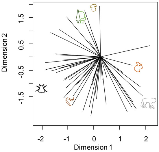 Multidimensional ranking of importance given by 47 kindergarten children (age 5–6 years old) to six living organisms in June 2019, in Norway. The 2D plot explains around 49% of the total variance. The children are represented by vectors pointing from the origin to their highest-ranked organisms. The first dimension can be interpreted as the overall importance of the six organisms. The leftmost (bumblebee) is the most important and the rightmost (wolf) is the least important organism. The second dimension can be interpreted as the overall variance of the six items. The bottommost item (wolf) has the largest variance, and the topmost item (mushroom) has the second largest variance among the six organisms.