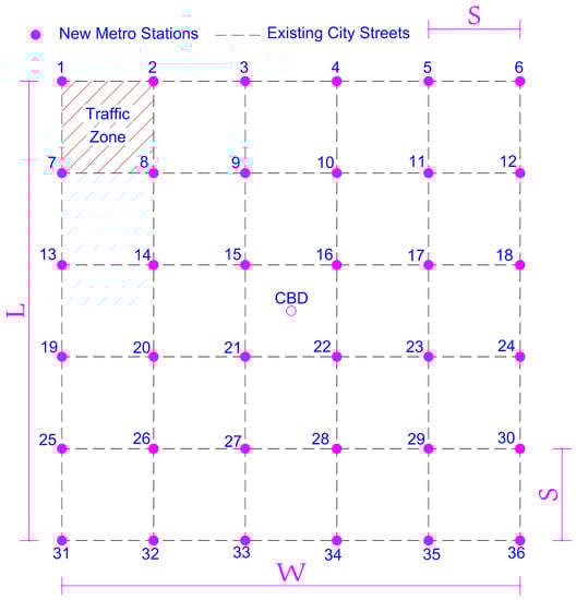 This subsection presents the existing square city of the assumptions considering fixed stations for both models. An existing city is assumed to be square with Width “W” (equal to Length “L”) and to have a square grid street with street spacing “S”, as shown in Figure 2. It is assumed in this paper that the three main items are as following: