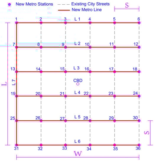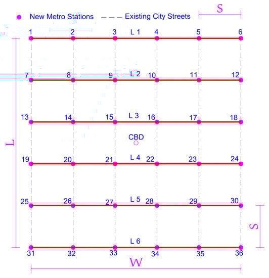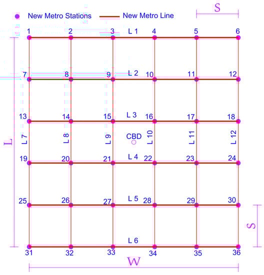 This subsection introduces a representation of the assumptions concerning the structure of the metro transit networks for both models. It is assumed for Model 1 that the metro network has a square grid system. Moreover, a central business district (CBD) is assumed to be in the middle center of an existing city. In this model, the grid metro network is achieved by metro lines in one or both directions. As in Figure 3, metro lines are assumed to be in one direction (L1, L2, L3,…, L6). Besides, metro lines are assumed to be in two directions (L1, L2, L3,…, L12), as shown in Figure 4.