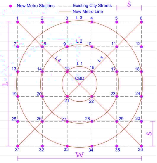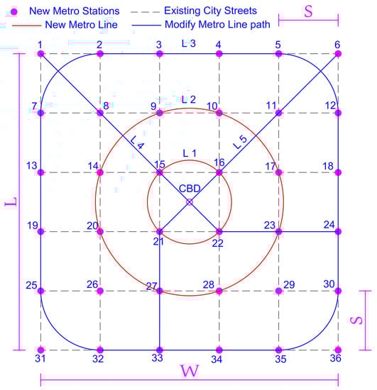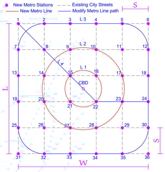 As in Figure 5, metro lines are assumed to be in ring direction (L1, L2, L3), and the radial direction (L4, L5). Additionally, in the same figure, metro stations are assumed to be fixed location in main street intersections. Additionally, modification of some metro paths is achieved, as shown in Figure 6.