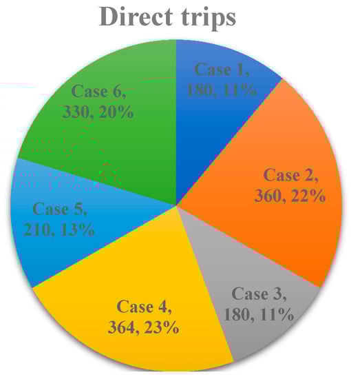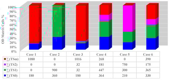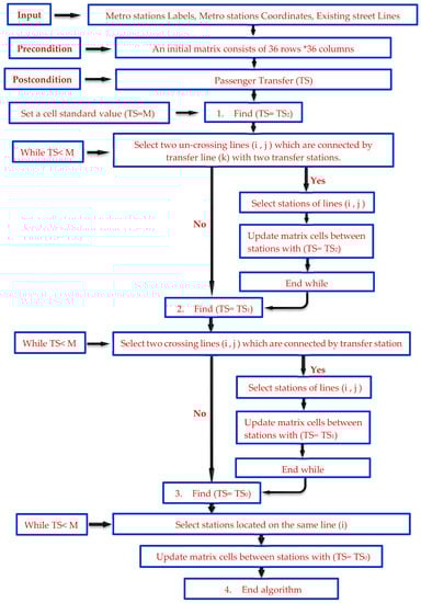 In Figure 1, () means that the passengers travel from the origin to the destination using direct trip without transfer stations (TS = 0). () means that the passengers move from the origin to the destination using two trips with one transfer station (TS = 1). () means that the passengers travel from the origin to the destination using three trips with two transfer stations (TS = 2). Finally, if none of these cases are found, a not-served demand pair is declared, where passengers cannot commute from the origin to the destination with the existing metro network ().