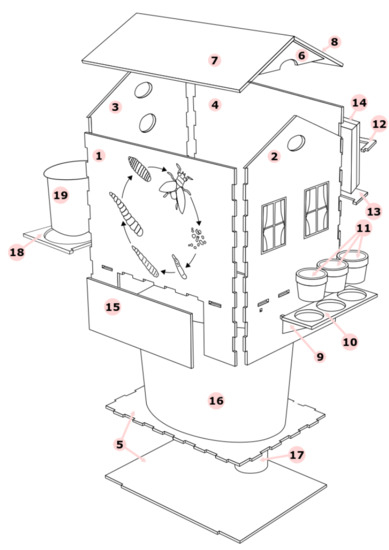 The BSFL rearing system (Figure 1) was designed and manufactured in cooperation with the Spielraum FabLab (Innsbruck, Austria). Vector-based digital plans were created in Rhino 6 (McNeel Europe. Barcelona, Spain) and corresponding DXF files were used in RDworks v.8 (RuiDa Technology Co. Ltd., Shenzhen, China) to laser cut 4 mm medium-density fibre (MDF) boards on a 100W CO2 laser engraving machine with RECI W2 laser tubes (Guangzhou Amonstar Trade Co., Guangzhou, China). The laser-cut wooden parts were sanded and assembled using a hot glue pistol: Four wall segments (① to ④) were fixed on the floor segments (⑤). The gable pieces (⑥) serve to underpin the roof elements (⑦ and ⑧). Smaller parts such as the plant potholder (⑨ and ⑩) for plant pots ⑪, the precision scale (⑭) attachment (⑫ and ⑬) and the drainage access cover (⑮) were added thereafter. Four round neodymium magnets (10 × 2 mm) serve to attach the drainage access cover and allow later removal. A tightly sealable, oval 5.5 litre standard size plastic bucket (⑯; Wolf Plastics Verpackungen, Leoben, Austria) mounted inside the wooden house served as a rearing container for BSFL and receptacle for the organic kitchen waste. A hole saw and a hot glue pistol were used to modify the bucket as follows: Two vents (Ø = 60 mm) were cut into the bucket lid and covered with a fiberglass net (mesh size 2 × 2 mm) to allow air circulation inside.