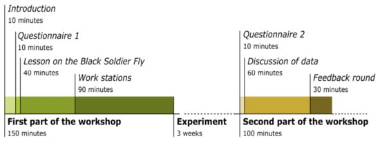 The project applied the idea of a student/scientist partnership (SSP) approach wherein students are active participants in a scientific research collaboration between students, teachers, and research scientists [37]. Learners worked with practicing scientists from the Department of Microbiology on an authentic scientific topic and conducted feeding experiments with the BSFL. The introductory workshop provided a hands-on approach to explore the context, the subject specific content as well as the scientific process. Students carried out the experiments in the class independently. Each school workshop (Figure 2) was conceptualized to last 250 min divided into a first part (150 min) at the beginning of the school experiment and a second part (100 min) upon termination of the feeding experiment. The total time corresponds to five full school lessons in Austria.