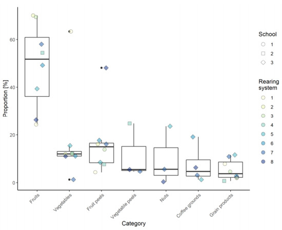 Proportional amounts of various categories of organic wastes used as larval substrate throughout the project. The points indicate the respective fraction of waste category added to each larval rearing station. The data were collected by the pupils from three different types of schools, distributed across four school classes, operating eight larval rearing stations in total.