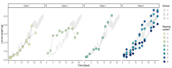 The BSFL rearing system designed for this study has proven itself as sustainable, low-maintenance, and easily reproducible option for similar feeding experiments. Moreover, the larval biomass output was comparable with results reported from other studies using organic food wastes (Figure 4; [19,48,49]). By avoiding the accumulation of excess liquid especially during early larval development while at the same time providing enough aeriation through the vents, larval activity was promoted without leading to the desiccation of the substrate. For future workshops, we suggest running the rearing units preferably outdoors or in dedicated biology laboratories. Larval activity in combination with elevated temperatures could further promote microbial activity taking place during the degradation of organic wastes and cause malodours. To promote prepupal migration, we suggest a wetting of the substrate with tap water of the organic wastes used in the final feeding event before experiments are terminated, since pupation occurs at dry, safe sides [24,34]. Furthermore, an additional school lesson at the end of the workshop would support pupils in summarizing the great amount of data they collected. Creating figures, calculating basic descriptive statistics, and presenting and discussing their results could add additional interdisciplinary value to the workshops.