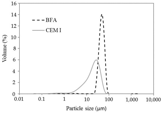 BFA was used for the preparation of high-volume mixtures to reduce the cement dosage. Figure 1 shows the particle size distribution of Portland cement together with BFA determined by the laser diffraction. As one can see, BFA had a similar fineness of particles compared to Portland cement. Namely, the average diameter was around 48 mm, which is only slightly coarser than Portland cement. The chemical composition of BFA revealed by the help of X-ray fluorescence (XRF) refers to the dominant share of SiO2, K2O, and CaO, which predetermines the applicability of BFA in cementitious materials (see Table 1). In Table 2, authors show the mineralogical composition of BFA and the amount of amorphous portion determined by X-ray diffraction (XRD). The reactivity of BFA is supposed to depend on the amorphous content. In general, the chemical and mineralogical composition is similar to FA obtained by various researchers who conclude the importance of an amorphous portion for successful incorporation into materials matrix and promotion of hydration at later ages []. In this study, the amorphous content consists of almost 53 wt.%, which can be accepted as satisfactory for the cement replacement []. The Chapelle test was used for determination of pozzolanic activity of raw BFA. The measurement was based on the quantification of Ca(OH)2 fixed by 1 g of BFA when mixed with 2 g of CaO and 250 mL of distilled water. The solution was heated up to 80 ℃ (kept for for 24 h) with continuous stirring. Then, the samples were filtered with the Bünner funnel and obtained filtrate was titrated against HCl with bromophenol blue indicator in order to provide OH− concentration. Consequently, Ca2+ content was given by help of titration with EDTA solution and Murexide indicator.