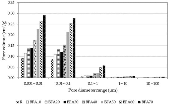 Results obtained from the MIP experiment accessed in Figure 2 reveal changes in pore size distribution in modified blended cement mortars. Apparently, incorporation of BFA affected the pore volume in all studied ranges, which complies with the increase in the total open porosity. A significant shift in the pore volume was obtained in microporous ranges from 0.001 to 0.01 µm and from 0.01 to 0.1 µm. The threshold parameter can be considered incorporation of 30 wt.% of BFA and higher, which induced substantial changes in the material microstructure. Mixtures having a higher content than 30 wt.% of BFA exhibited a gradual increase in pore volume. Here, the maximal pore volume for BFA70 reached almost a level almost three times higher compared to the reference mixture. On the other hand, only minor changes were observed in the macroporous range. Revealed changes can be assigned to changes in the workability of the fresh mixture and increased w/b ratio.