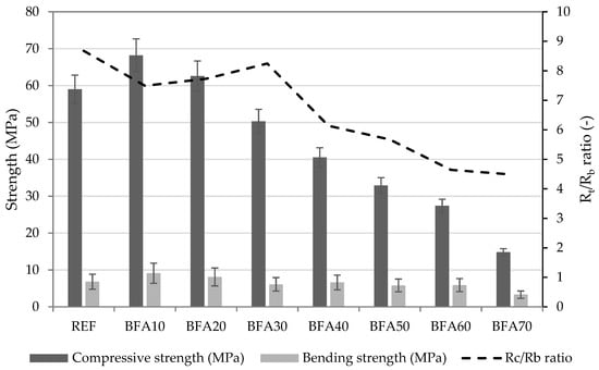 Looking at Figure 3 where the mechanical performance of the studied mixture is given, a considerable both compressive and bending strength reduction can be distinguished for mixtures having a higher content of BFA. On the other hand, a slight improvement in both mechanical parameters was achieved when 10 wt.% and 20 wt.% of BFA was applied. Specifically, the compressive strength was shifted to about 16% in the case of BFA10 and 6% for BFA20. The obtained increase in bending strength was even more distinct: 33% for BF10 and 19% for BFA20. However, incorporation of dosages exceeding 20 wt.% induced a gradual decrease in mechanical performance. A satisfactory mechanical resistance was gained up to 40 wt.% of cement replacement when compressive strength resulted in 40.5 MPa. BFA50, BFA60, and particularly BFA70 induced substantial reduction of studied mechanical parameters. Lowered results of mechanical strength comply with the changes in material porosity, as described above. In other words, mixtures containing from 40 to 70 wt.% of BFA dosage showed a substantial strength loss as a result of a shift in material porosity. In the light of these findings, 30 wt.% can be accepted as a threshold parameter for mixture design. Provided compressive/bending strength ratio Rt/Rc shows a more significant decline of compressive strength compared to bending strength. Contrary to the results of de Matos et al. [], who studied the effect of high volume dosages of FA, incorporation of BFA improved the strength only when applied up to 20 wt.%. In comparison to the traditional SCMs such as furnace slag of CFA, BFA used in this study does not provide sufficient preservation of mechanical performance due to limited reactivity and lower content of the amorphous phase that caused a worsening of the mechanical strength. Notwithstanding, the perspectives of biomass-based ash as an alternative SCM to CFA were noted by Memon et al. [], who described the correlation between the burning temperature and pozzolanic activity. The follow-up work of Amin et al. [] achieved similarly promising results with cement replacement up to 30%. Apart from the mentioned issues, a substantial effect on functional properties is accompanied by the diameter of the particles []. To be more specific, more favorable results of the compressive strength correlate with higher amorphous portion and particle size. Therefore, particular importance needs to also be paid to the source of the biomass and type and combustion temperature that may influence the obtained results considerably [].