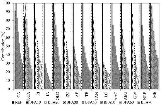 The goal of the performed environmental analysis was to evaluate the effect of cement replacement by high levels of BFA on the environmental impacts. The simplified environmental analysis was performed to access the benefits associated with partial replacement of Portland cement by BFA during the production stage. The functional unit of 1 metric ton of final blended mortar modified by 0, 10, 20, 30, 40, 50, 60, and 70 wt.% of BFA was analyzed. In the scope of this study, the Impact 2002+ methodology (version 3.15, Simapro 8.5) includes 15 impact categories that provide a robust platform for the determination of environmental load at both midpoint and endpoint level [].