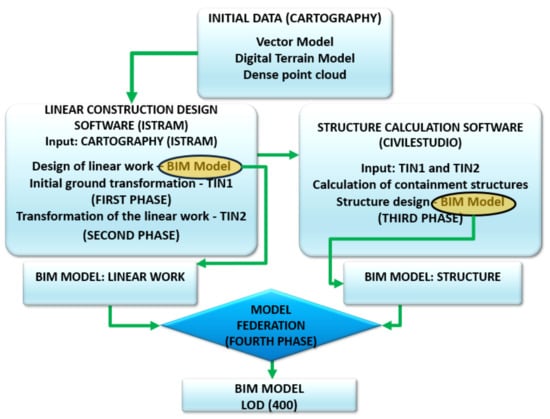 In the AEC industry, the development of computational design has allowed the introduction of structural elements in the modelling of linear works, among which culverts, walls, bridges, tunnels, etc., stand out, thus achieving a parameterization of them, as well as a connection with the construction as a whole [10,11,12,13]. Computational design allows the model to be highly flexible since the modification of the characteristics of the linear work implies an automatic adaptation of the structural elements. This concept of “associativity” that is linked to the propagation of design changes is the critical factor used to maximize the benefit of integration between different applications that support the collaborative design process.