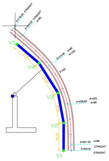 In general, there are two situations that should be differentiated. If the retaining structures are positioned in a straight section of the projected linear work, the horizontal alignment of the same is polygonal with a single alignment. However, when the structure to be designed is located in a curved section, its definition assumes a polygon with several straight alignments (see Figure 2).
