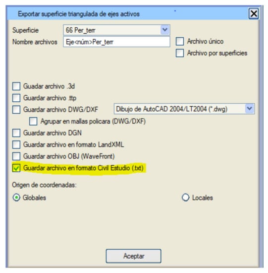 Once the TIN option was chosen for the modelling of terrain surfaces and designed linear works, as it must have a certain format so that the structural calculation software is able to interpret it correctly. The format is described in Table 2. This data structure is identical to define both the original terrain surface and the platform of the projected linear work. Figure 3 displays an image corresponding to the TIN export options provided by the ISTRAM linear construction software package used in this work.