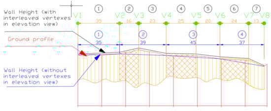 In order to accurately and automatically determine the heights of each section of the structure, the CivileStudio structural calculation software contains an algorithm that calculates the intersection of the plane of each section of the wall with the TIN representing the ground surface. Therefore, the problem consists of solving a set of linear equations, Equations (1) and (2), whose solution is a set of straight lines—whose projection on the horizontal plane coincides with the initial polygon—representing the height of each section of wall.