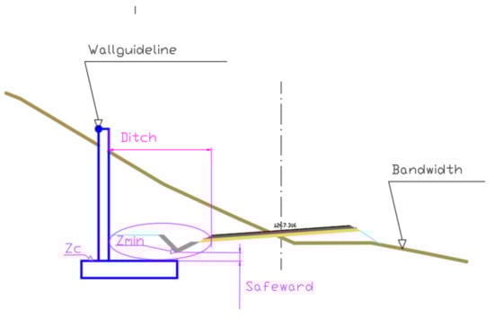 The polygon that defines the position of the structure corresponds to the upper vertex in contact with the ground surface (Figure 2). The distance between the polygon which defines the direction of the wall and the axis of the road is determined by various factors: structural conditions which allow the geometric fit of the structure with respect to the platform [15], aspects related to visibility which will determine the minimum distance [16], geotechnical aspects [17,18], etc.