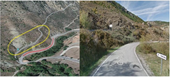 This section applies the methodology set out in Section 3 on a mountain road located in the province of Teruel (Spain). The aim is to increase the width of the roadbed which currently has a total width of 5 m to 8 m: a 6 m roadway plus 1 m verges on each side. The layout is unique in that, as can be seen in Figure 8, there is a service road on the left side of the road which is to be widened, and on the right is the ravine of the Camarena River. With these conditions, it is necessary to build retaining walls that allow the optimization of the terrain, as well as the retaining structures which are to be built.