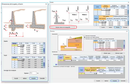 This information makes it possible to establish coherence between both models (linear work and structure) so that the connection between the two can be guaranteed, then the rest of the parameters to finish the design of the structure must be entered. These parameters obey geotechnical and structural criteria. Figure 11 shows the interface for the introduction of data. There are three clearly differentiated sections: information referring to the footing, elevation and terrain. In the interfaces corresponding to the elevation and terrain, the tab that automatically calculates the data relating to the geometry of the terrain and the platform is highlighted in red (Figure 11).