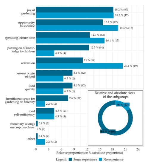 Figure 1 shows that the importance of drivers differing for these two different groups. The most important driver for gardeners with previous gardening experience was the joy of gardening—which can also be described as the above-mentioned connection with nature and physical contact with the soil, social interactions, spending leisure time and passing on of knowledge to children. On the contrary, the most important driver for gardeners without previous cultivation experience was the ability to relax, followed by social interactions, joy of gardening and spending leisure time.