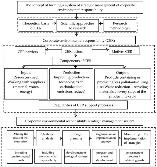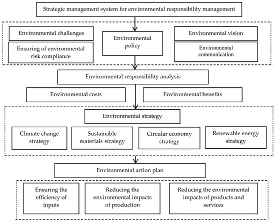 A company’s chosen level of environmental responsibility is a management decision. To permanently increase a company’s level of environmental responsibility, the authors of this contribution put forward a strategic management system for CER, which includes an environmental policy, environmental strategy, and environmental action plan. The environmental goals and identified areas for transformation require the mobilization of all a company’s subsystems and the development and drafting of an environmental action plan that contains targets, quantitative indicators, and time horizons. This targeted accountability program is an important tool for managing environmental responsibility because it confirms that all stakeholders follow the concept of sustainable growth, as well as ensures the implementation of the environmental goals into all aspects of a company’s operational activities.