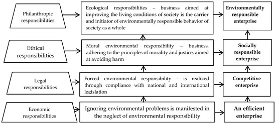Synthesis of the evolution of the main goals and drivers of company development, which are embodied in the lifecycle stages, allows us to identify the following main stages of organizational transformation: efficient company, competitive company, socially responsible company, environmentally responsible company. If we consider the proposed stages of company development through the prism of the pyramid of corporate social responsibility, as proposed by Carroll [46], we can distinguish several types of companies according to the levels of implementation of the principles of environmental responsibility in management processes, as shown in Figure 2.