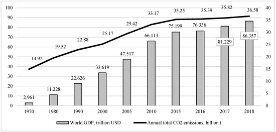The long-term strategic-oriented vision of humanity’s future is reflected in the concept of sustainable development, formulated as the agenda of society for the 21st century, which determines the need to manage a systemic whole—the chain “man–biosphere–economy”. As early as 1798, the English economist and priest Thomas Malthus (“An Essay on the Principle of Population”) [1] formulated the problem of human impact on the environment, which remains unresolved and exacerbated under today’s circumstances. For example, from 1960 to 2000, the world’s population doubled from 3 trillion to 6 trillion, with the value of GDP during this period increasing 24.6 times. From 2000 to 2019, the dynamics slowed down, but the world’s population still increased by 25.5% to 7.6 trillion, with total GDP increasing 2.6 times [2]. That is, the increase in the world’s population causes an n-fold increase in total output, and therefore a significant increase in the consumption of natural resources, including materials, water, energy, and more. Analysts estimate that 50% more natural resources are extracted and used today than 50 years ago; about 60 billion tonnes of raw materials per year [3]. According to UN forecasts, by 2050, the world’s population will increase from 7.6 to 9.8 billion people [4]; the number of middle-class consumers will increase to 5.2 billion people by 2030 [5], respectively, and the demand for resources will increase exponentially. By 2030, the world population’s need for food will increase by at least 50%, for energy by 45%, and for water by 30%. Given the current trends in the consumption of natural resources, their production by 2030 may increase to 100 billion tonnes [3], which means an even greater burden being placed on the environment and the accumulation of environmental problems.