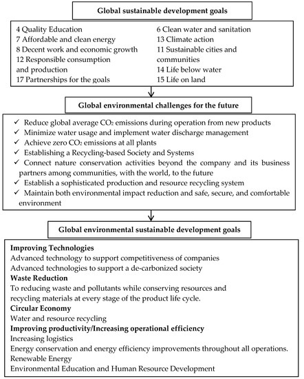 Sustainable development theory, based on the macro level in response to the complexity of the functioning and development of society [27,28,29], identifies an increase in the requirements for companies to incorporate environmental goals into their overall system of development goals and to consider them of equal importance to their economic and social goals. The implementation of the concept of sustainable development manifests itself in the separation of a company’s interactions with its external environment in a separate important subject of management and by elevating this interaction to a management level of responsibility.