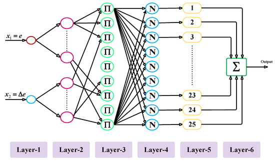 The inputs of the NFC are error (e) and change in error (∆e). The five membership functions were chosen for each input [43]. It can be seen that membership functions are executed in the second layer. In this case, the membership function is substituted by an activation function for each artificial neuron. The output of this layer is as follows: