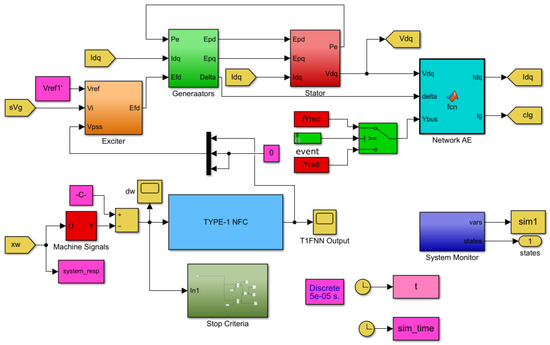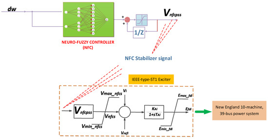 In the NFC structure, precondition parameters of the membership layer have been trained in the simulation model. During the simulation studies, outcome parameters have been trained using a back-propagation learning algorithm. The complete structure of the NFC damping controller-based interconnected test power system is shown in Figure 4. To control the LFO in the system, the synchronous rotor speed deviation is applied to the NFC controller. A reference value for NFC signal is obtained from the output of the NFC controller. These voltage signals are sent to the excitation system block, which generates the required signals for damping the LFOs in the test system.