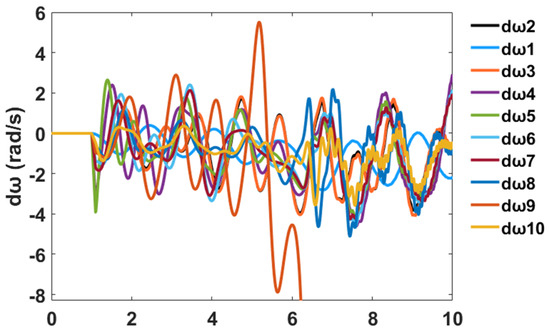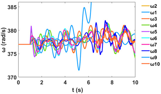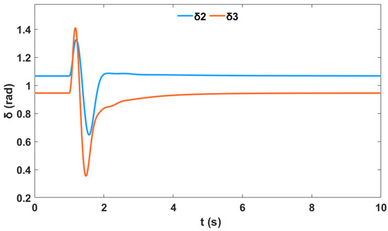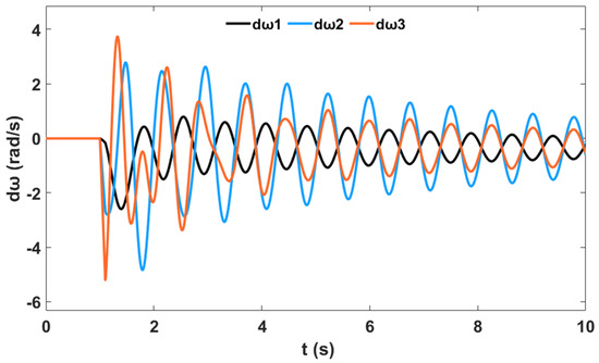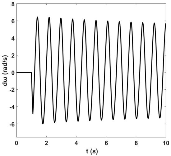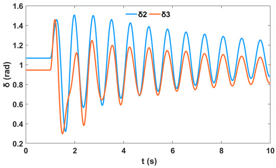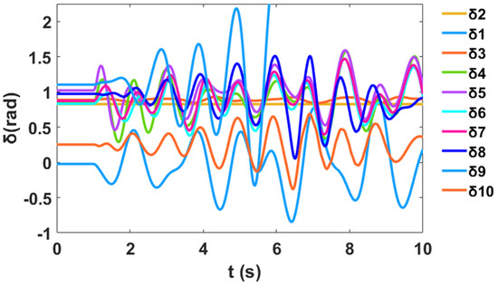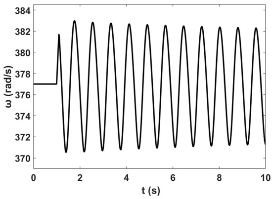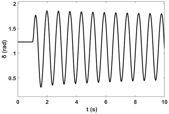 In addition, a nonlinear time-domain simulation was performed, and Figure 5 shows the unstable generator relative power angles δ in radian for the system without PSS and NFC, while Figure 6 shows the unstable generator speed deviation in radian per second for the system without PSS and NFC. Similarly, Figure 7 shows the unstable system rotor speed response in radian per second for the system without PSS and NFC.