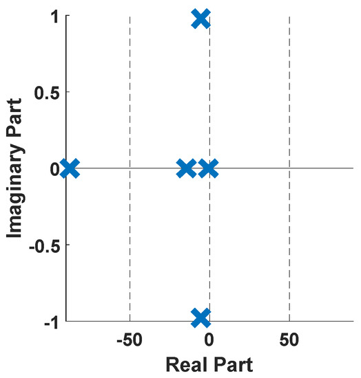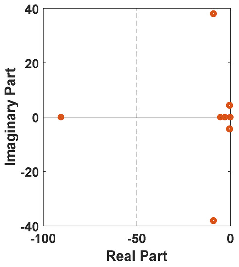 In this case, the test power system is equipped with an NFC stabilizer, and a symmetrical three-phase fault is subjected to the system. Table 5 shows the eigenvalues results with their associated damping ratio and frequency for the power system case with NFC installed in the system, respectively. From Table 2, Mode 2 produces a weak damping ratio for the no PSS case condition. After the NFC design, these modes were impressively enhanced from up to a stable mode of respectively, using the NFC stabilizer. Similarly, the worst damping ratio EM was improved from to using the NFC. Similarly, Figure 13 illustrates the eigenvalues plot for the system with the NFC stabilizer controller based on the numerical simulation results of Table 2 and Table 5.