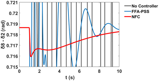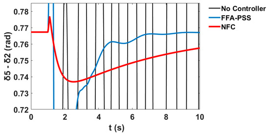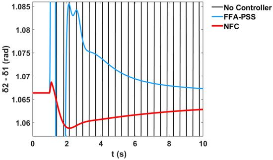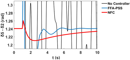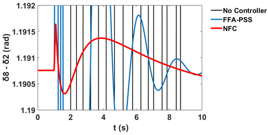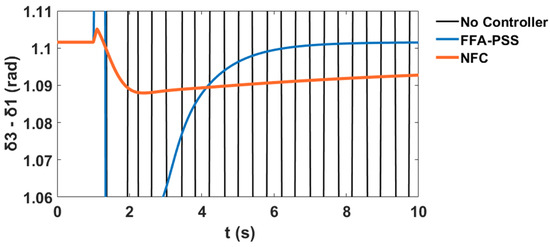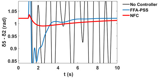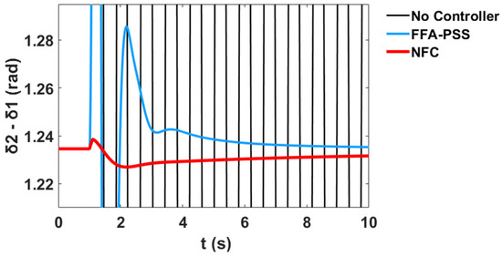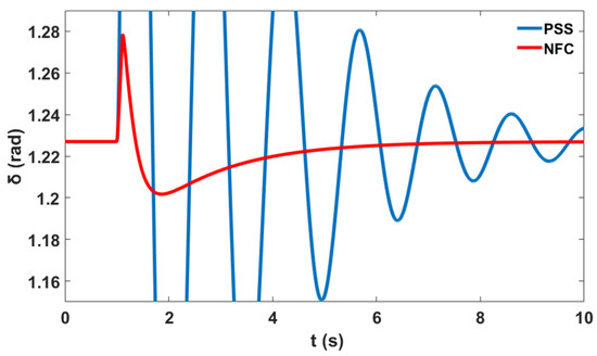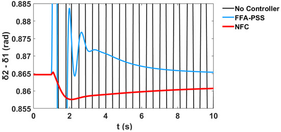 This section presents comparative simulation results between the proposed NFC and the PSS damping controllers for LFO’s robustness. The generator power angles δ in radian for and with respect to illustrate the system stability profile of the system without the controller, with PSS, and with the proposed NFC, as shown in Figure 58 and Figure 59 respectively.