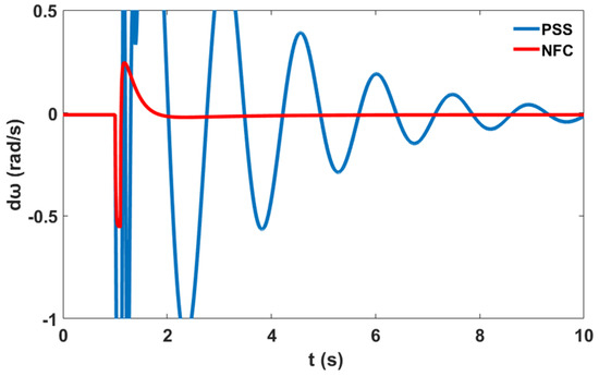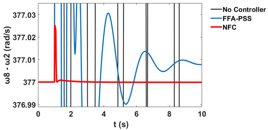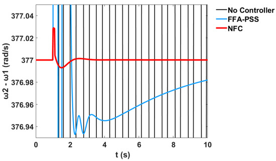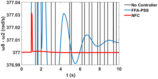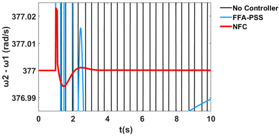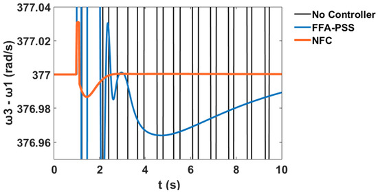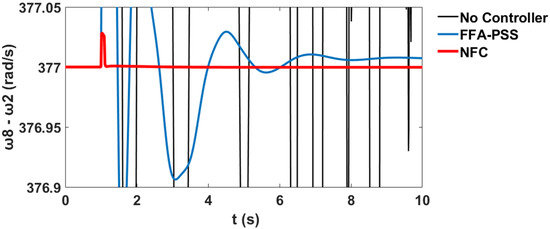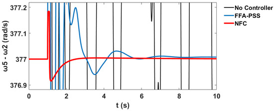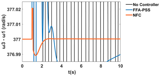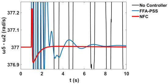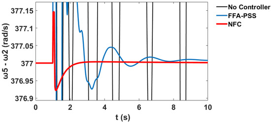The variation in the generator speeds for and relative to corresponds to the system stability profile of the system without the controller, with PSS, and with the proposed NFC, as shown in Figure 60 and Figure 61 respectively.