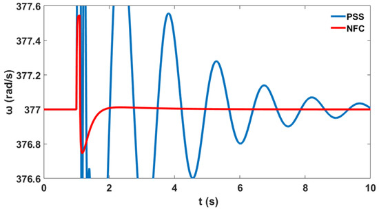 Moreover, a nonlinear time-domain simulation was performed with NFC installed in the system, and Figure 14 shows the stable generator relative power angles δ in radian for the system with NFC, while Figure 15 shows stable the generator speed deviation in radian per second for the system with NFC. Similarly, Figure 16 shows the stable system rotor speed response in radian per second for the system with NFC.