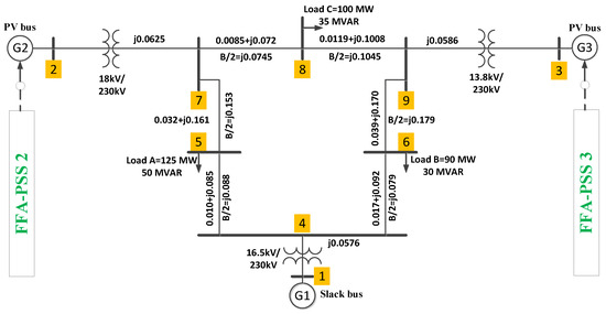 Table 1 shows the suitable choice of parameters used for the FFA algorithms, which help the algorithms achieve optimal convergence speed and a fast computational cost for the PSS design [45]. The optimization process was terminated by a pre-specified number of iterations for all the three algorithms, and it is worth mentioning that the PSS design method was initialized and run several times before the optimal parameters of the PSS were chosen [46].