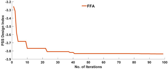 The rate at which the PSS design index converges using the FFA search algorithm is shown in Figure 8, while the optimal parameters of the designed PSSs are shown in Table 3. From the convergence characteristics, the FFA method shows a good convergence rate at eight iterations.