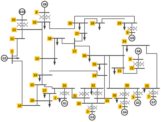 where is the set of the first-order nonlinear differential equations that represent the system and the controller dynamics, is the vector of the state variables, represents the vector of the algebraic variables, is the vector of the input variables, is the set of nonlinear algebraic equations that describes the network power flow equations, is a set of output variables, and is the set of equations that represents the output variables. In this study, represents the vector of the bus voltage magnitudes and phase angles, represents the PSS output signals. , where, and are the rotor angles and rotor speed, respectively, while and are the internal and field voltages, respectively.