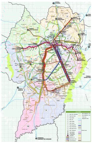 - IPPUC. Curitiba Institute of Urban Planning and Research—Maps from Curitiba. 2019. Available online: https://www.urbs.curitiba.pr.gov.br/transporte/rede-integrada-de-transporte/32 (accessed on 7 November 2019).