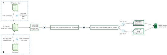 This stage’s main objective was to establish the origin and destination information of users of public transit. Since only the entry into the system is recorded, as a result of this preprocessing, we kept only the data from which we were able to infer the origin and destination based on the usage history of each smart card.