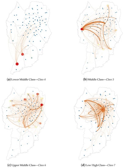 We now turn our attention to the mobility performed by the studied users. Figure 3 shows our public transit mobility networks corresponding to classes 4, 5, 6, and 7 of Curitiba (the only ones observed in the city according to the 2010 Census). All networks contain all nodes, that is, all Curitiba’s neighborhoods, and they are positioned in the images according to their actual positions in the city. However, we do not observe necessarily activities in all neighborhoods for all classes. There are cases where the class ( = 4,…, 7) neither live nor visit other city neighborhoods. In this case, the effective number of non-isolated nodes in the transit mobility network of class is . The edge’s size reflects their weight, i.e., thicker ones are heavier ones. In each class represented, the nodes of larger sizes are those with greater strength and belong to the studied class.