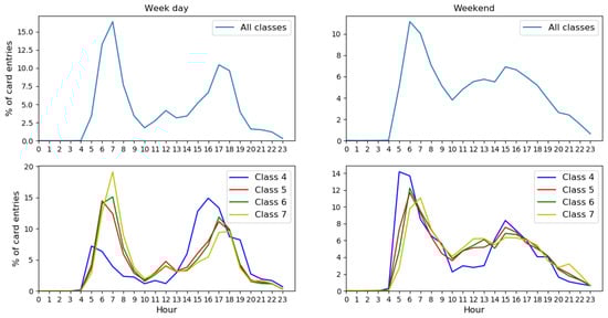 Distribution of the number of smart card use throughout the day. The first row refers to all users, i.e., aggregated results, while the second row shows individual classes results.