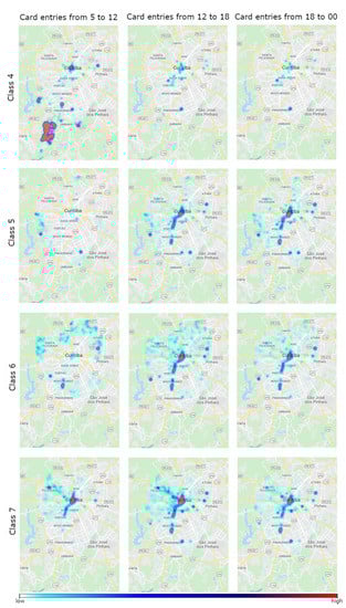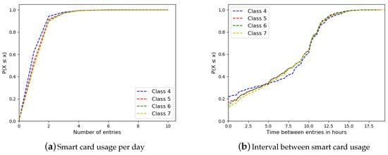 For all classes, the vast majority of smart card users use the system only twice a day (more than 80%—Figure 5a), with an interval of more than 10 h between these uses (Figure 5b). This underscores the hypothesis that public transit users use the system for displacements for specific purposes, such as going to work.