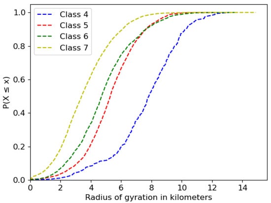 To analyze the urban displacement performed by individuals from each of the economic classes, we used the radius of gyration [32], calculated according to the Equation (6):