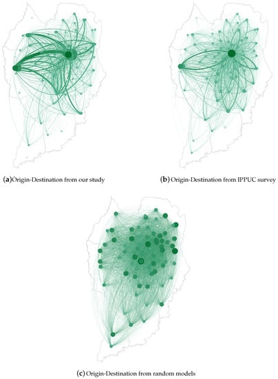 To analyze Curitiba’s public transit mobility, we use the origin-destination information, described in Section 4.2, to construct urban transit mobility networks. We used as origin the inference of home neighborhood and as the destination the most frequented neighborhood of each smart card. We created a matrix M of the order , where , that is, the neighborhoods of Curitiba.
