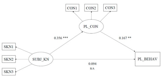 Test for the mediating role of PL_CON on SUBJ_KN. Notes: n.s. = non-significant; significance at ** p < 0.01, and *** p < 0.001.