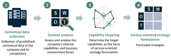 The service-oriented strategy formulation method [39] developed based on the general strategy formulation from the strategic management field that was modified to merit the servitization characteristics [90]. Figure 2 illustrates how the proposed method supports the formulation of service-oriented strategies for servitization of a manufacturing company through four steps.