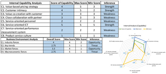 The output of Step 2 is the assessment results presented in a score recapitulation table and radar chart. This output provides the identification of the company’s strengths, weaknesses, opportunities, and threats (SWOT) following the assessment score of each internal and external factor. If an internal factor has a cumulative score of more than 3, this point presents the strength of the company. However, if the score is equal or less than 3, it represents the company’s weakness. The business environment analysis also applies the same mechanism to determine opportunities and threats. The identification of strengths, weaknesses, opportunities, and threats in this proposal is different from the original SWOT analysis in which the analyst can loosely list strengths, weaknesses, opportunities, and threats of the company [91]. This modification of SWOT analysis to the structured assessment aims to restrain fuzzy and unfocused discussion. This mechanism affords the company to assess its condition compared to the required capabilities and business environmental scanning (as reflected in a set of indexes) for servitization. As a result, the future formulated strategies can be targeted to the improvement of the shortcoming capabilities by carefully considering the external business spectrum. Moreover, the radar diagram presents a clear visualization of the current condition compared to the desired capabilities for servitization.